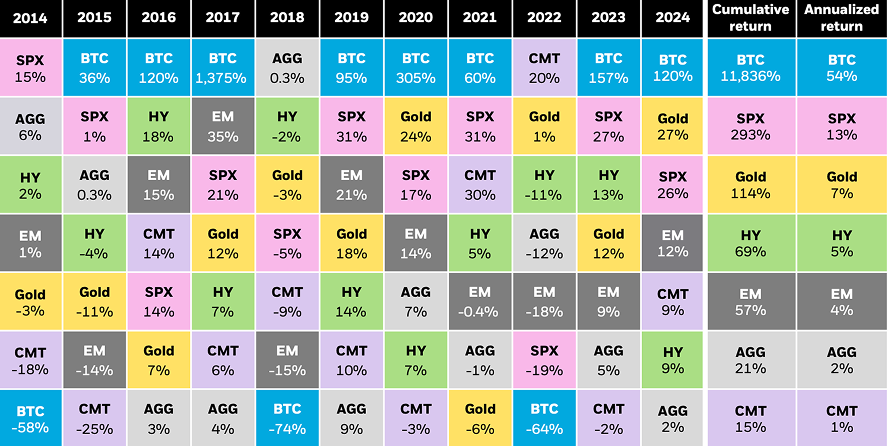 Bitcoin has historically ranked among both the best- and worst-performing major assets, demonstrating high growth potential but significant volatility.