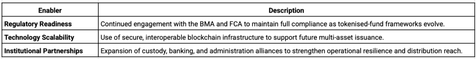 This structure ensures that every token is traceable, redeemable, and compliant under Bermuda and UK law, a true digital security representing regulated fund shares.