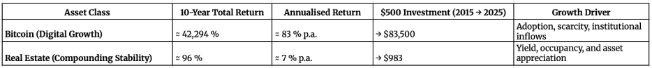 Bitcoin’s structural growth and the compounding income of institutional real estate and infrastructure.