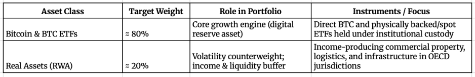 Approximately 80% of the portfolio is allocated to Bitcoin and Bitcoin ETFs, capturing long-term digital-asset expansion. The remaining 20% is invested in institutional-grade real estate and infrastructure across OECD jurisdictions, providing consistent income and strengthening liquidity during market cycles.