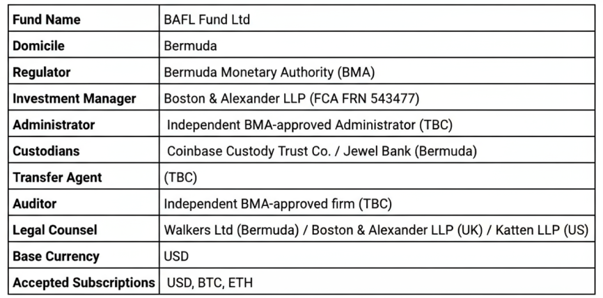 The Fund is managed by Boston & Alexander LLP, an FCA-authorised Alternative Investment Fund Manager (AIFM), and is domiciled in Bermuda as a Standard Fund under the Bermuda Monetary Authority (BMA). This dual-regulated foundation combines the oversight of a UK-regulated manager with Bermuda’s established digital-asset legal framework.