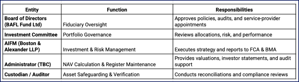 - AIFM / Compliance Officer: Oversees risk management, reporting, and dual-jurisdiction compliance under the FCA and BMA.