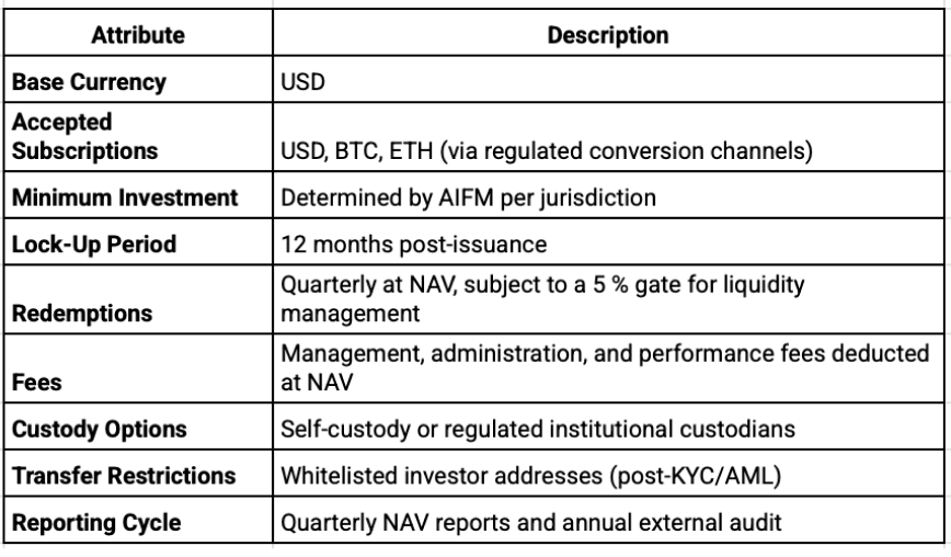 - Accepted Subscriptions: USD, BTC, and ETH (converted through regulated channels)