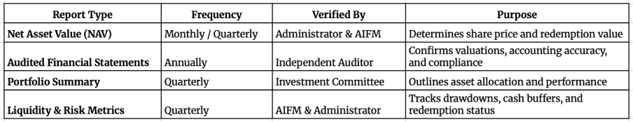 - Reporting Frequency: NAV calculations monthly or quarterly; audited annual statements