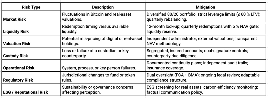 Risk oversight is embedded within the Fund’s AIFM and BMA compliance structures. Each category of risk is identified, assessed, and monitored through defined policies and independent reporting…